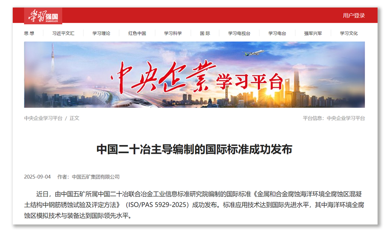 9月5日,中國五礦外部門戶網站轉發“學習強國”央企聯播欄目報道的《中國二十冶主導編制的國際標準成功發布》。近日,中國五礦及中國中冶多個媒體平臺相繼宣傳了此項國際標準。