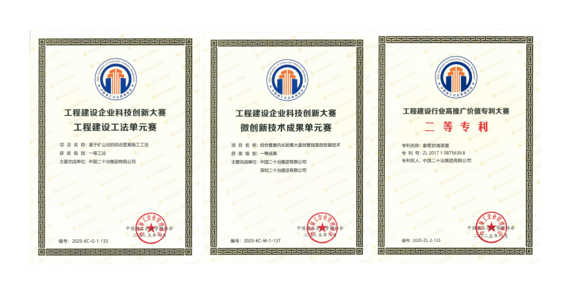 深圳二十冶申報的三個項目從6376項參賽項目中脫穎而出,《基于礦山法的綜合管廊施工工法》榮獲工程建設工法單元一等工法、《綜合管廊內長距離大直徑管線高效安裝技術》榮獲微創新技術成果單元賽一等成果、《套管封堵裝置》榮獲工程建設行業高推廣價值專利大賽二等專利。