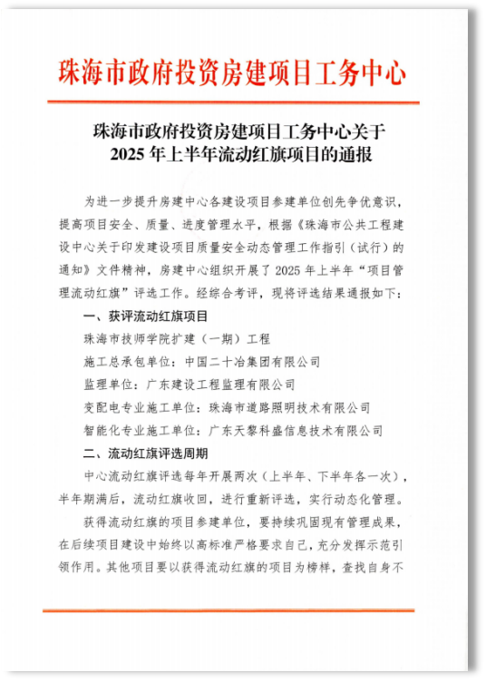 9月18日,珠海市技師學(xué)院擴(kuò)建(一期)項(xiàng)目收到市房建中心通報(bào)表揚(yáng)文件,因建設(shè)成效突出,項(xiàng)目獲得市房建中心“優(yōu)良工地流動(dòng)紅旗”。這是項(xiàng)目繼2024年獲此榮譽(yù)后再度上榜,充分體現(xiàn)了市房建中心對(duì)項(xiàng)目建設(shè)成果的高度肯定。