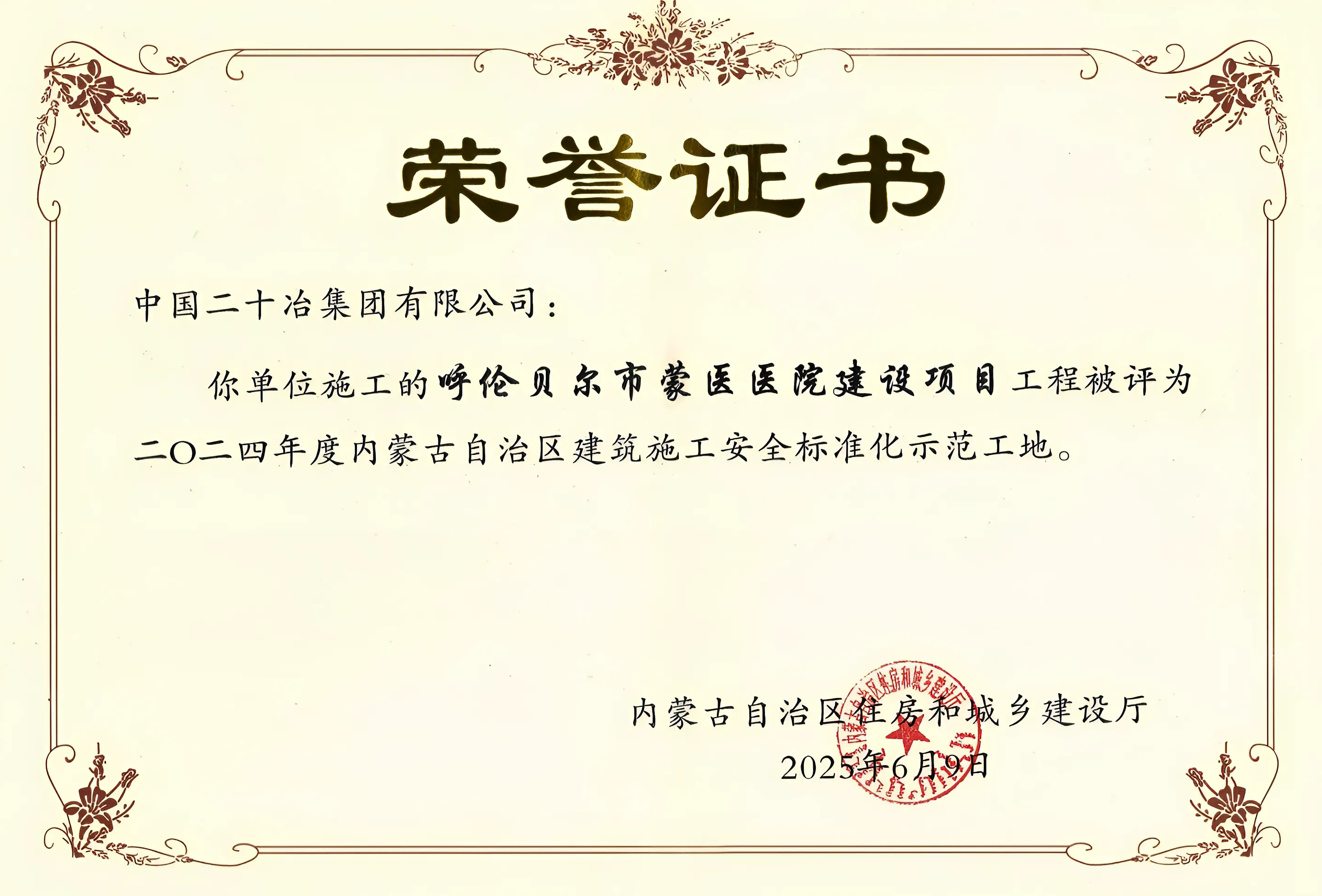 9月22日,天津二十冶承建的呼倫貝爾市蒙醫醫院項目榮獲內蒙古自治區建筑施工安全標準化示范工地榮譽稱號。