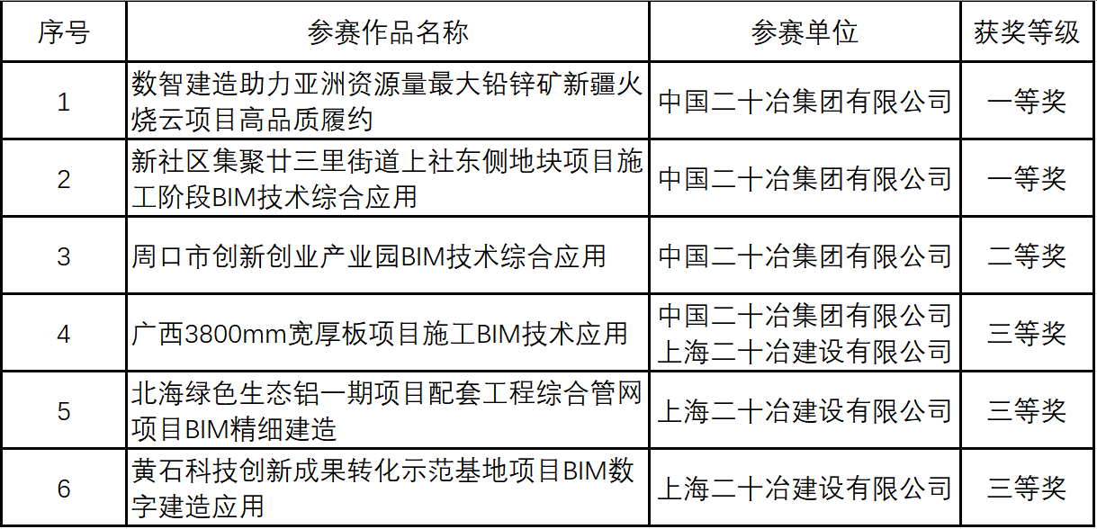 9月19日,由中國冶金建設協會主辦的第七屆冶金建設行業BIM大賽結果揭曉,中國二十冶共獲獎6項,其中一等獎2項、二等獎1項、三等獎3項。“數智建造助力亞洲資源量最大鉛鋅礦新疆火燒云項目高品質履約”和“新社區集聚廿三里街道上社東側地塊項目施工階段BIM技術綜合應用”兩項成果獲評一等獎。
