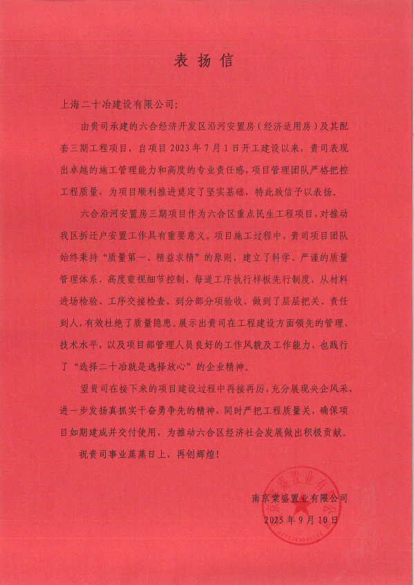 三封表揚信既是對項目建設成果的充分認可,更是對上海二十冶專業實力的有力佐證。在后續項目建設中,上海二十冶將持續發揚真抓實干、奮勇爭先的精神,嚴守質量關、嚴把進度關,充分展現央企風采,為江蘇區域經濟社會發展與民生改善貢獻更多優質工程力量。