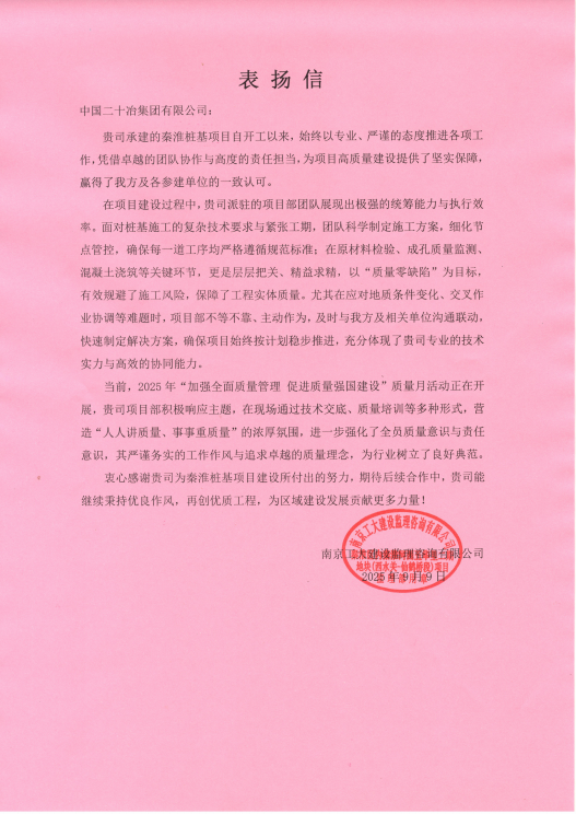 9月27日,上海二十冶三個在建項目收到來自建設方的表揚信。南京棠盛置業有限公司、南京工大建設監理咨詢有限公司、上海永德房地產發展有限公司分別向南京六合經濟開發區沿河安置房三期項目與南京秦淮樁基項目、上海二十冶御品園林B地塊發來贊譽,對上海二十冶在工程建設中展現的專業素養、管理能力與責任擔當給予高度肯定。