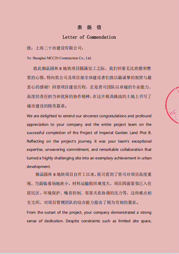 永德地產在表揚信中指出,項目團隊不僅以專業能力成功克服了各項技術難題,更以高度的責任擔當有效化解了環境約束壓力,并通過真誠的溝通構建了和諧的社區關系。團隊用實際行動詮釋了當代優秀建設者的職業風采,其秉承的“超越自我,追求卓越”的企業精神,是項目得以安全、優質、高效完成全部建設任務,并實現“零重大安全事故、零重大質量缺陷”優異管理目標的關鍵所在。