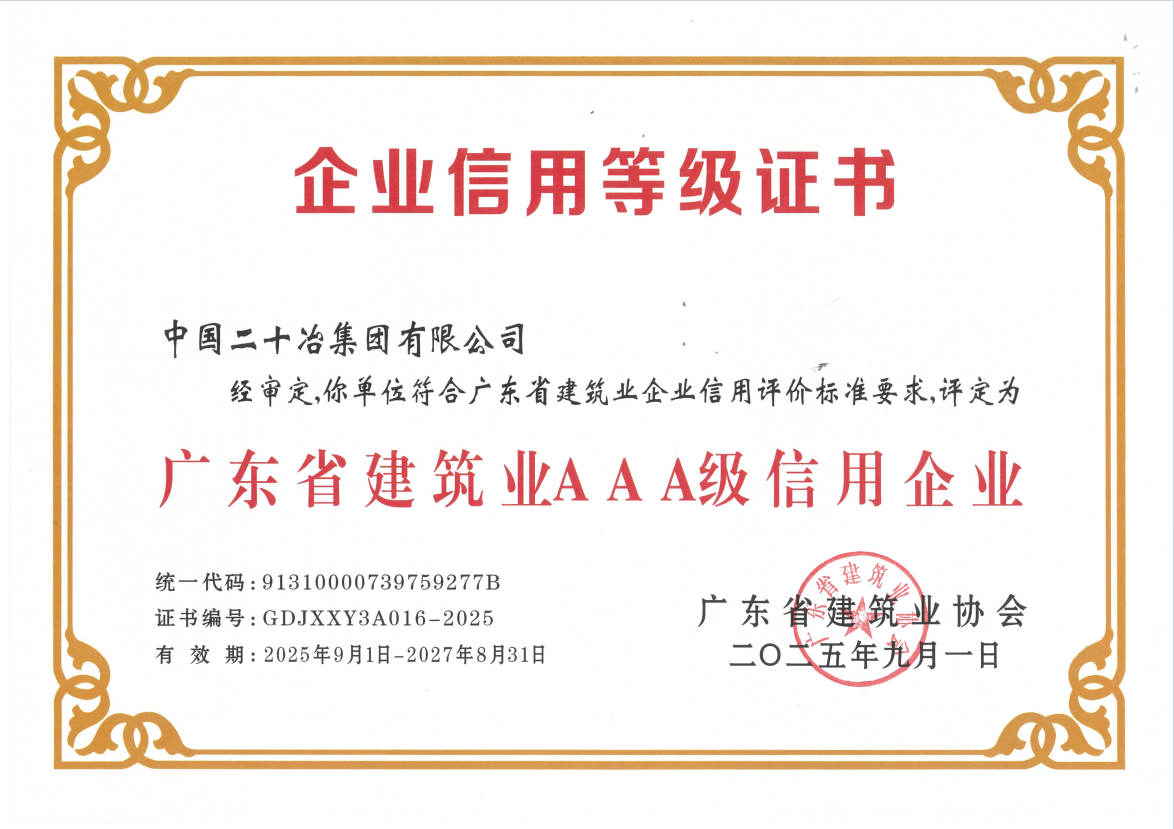 10月24日,廣東省建筑業協會在廣州市召開2025年度廣東省建筑業企業誠信建設交流會,會議對2025年度廣東省建筑業AAA、AA級信用企業進行了推介發布,中國二十冶獲評廣東省建筑業信用評價“AAA”級企業。